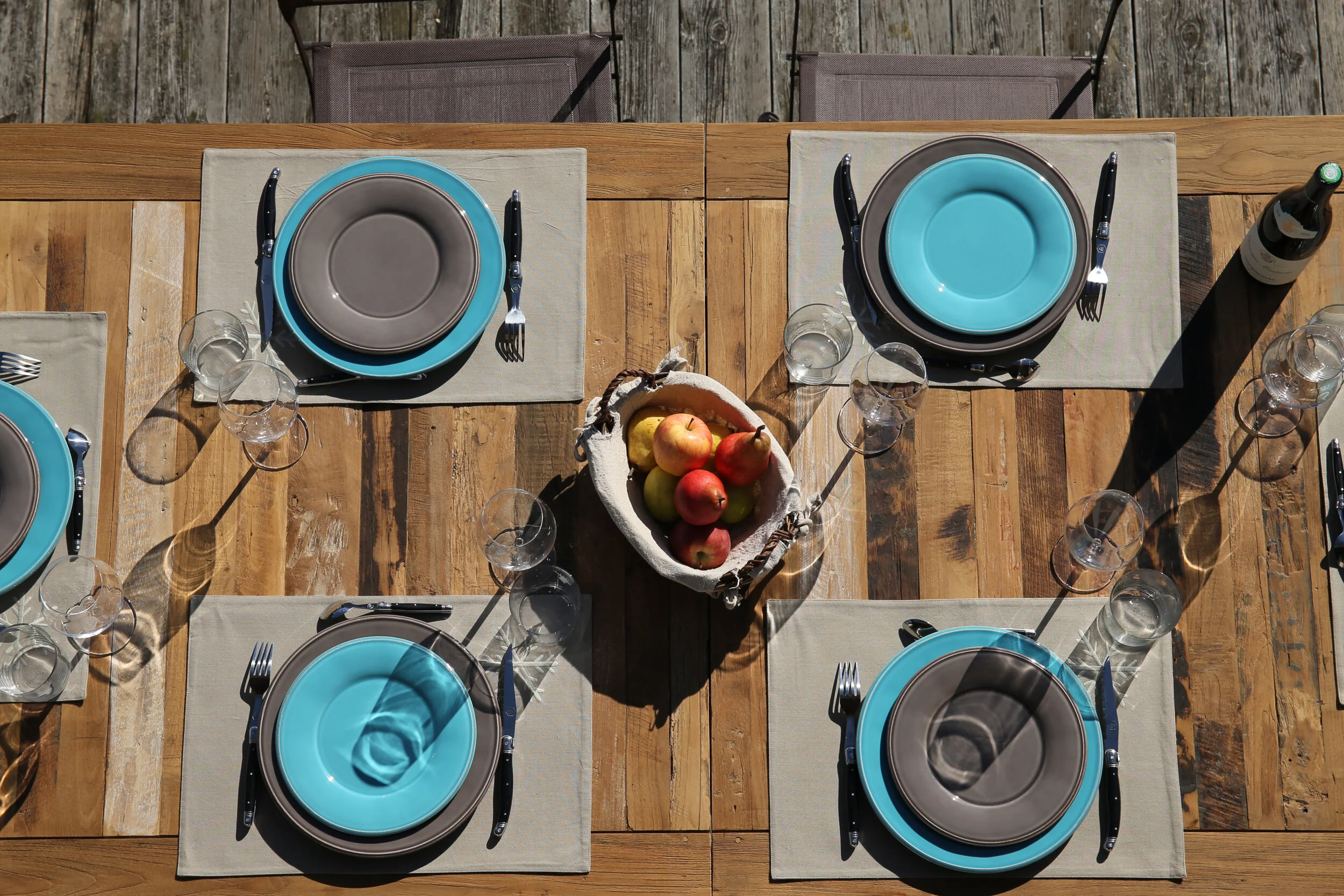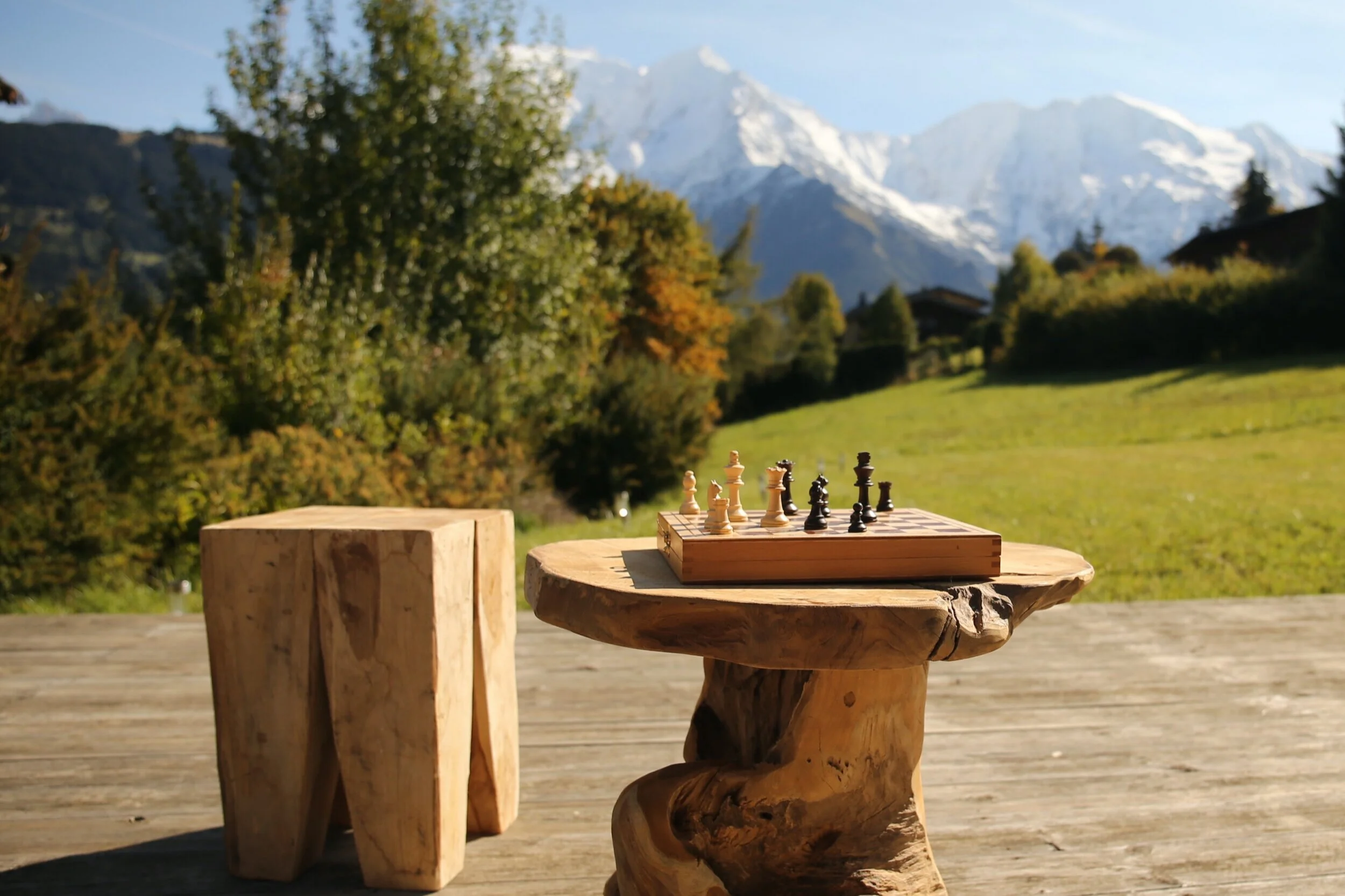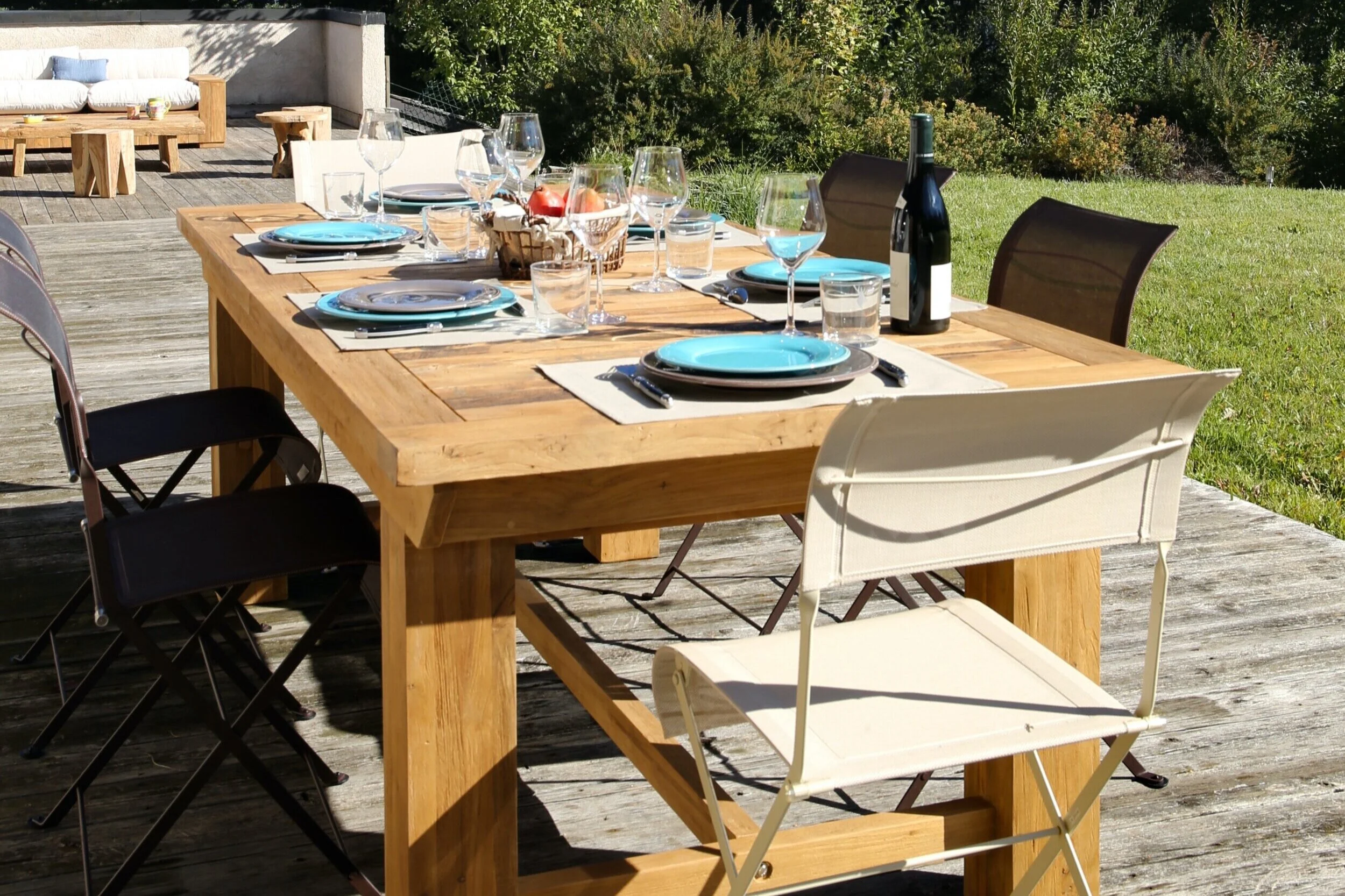 À l’extérieur sur la terrasse, une belle table extensible peut accommoder jusqu’a dix personnes avec une vue imprenable sur la chaine du Mont-Blanc.