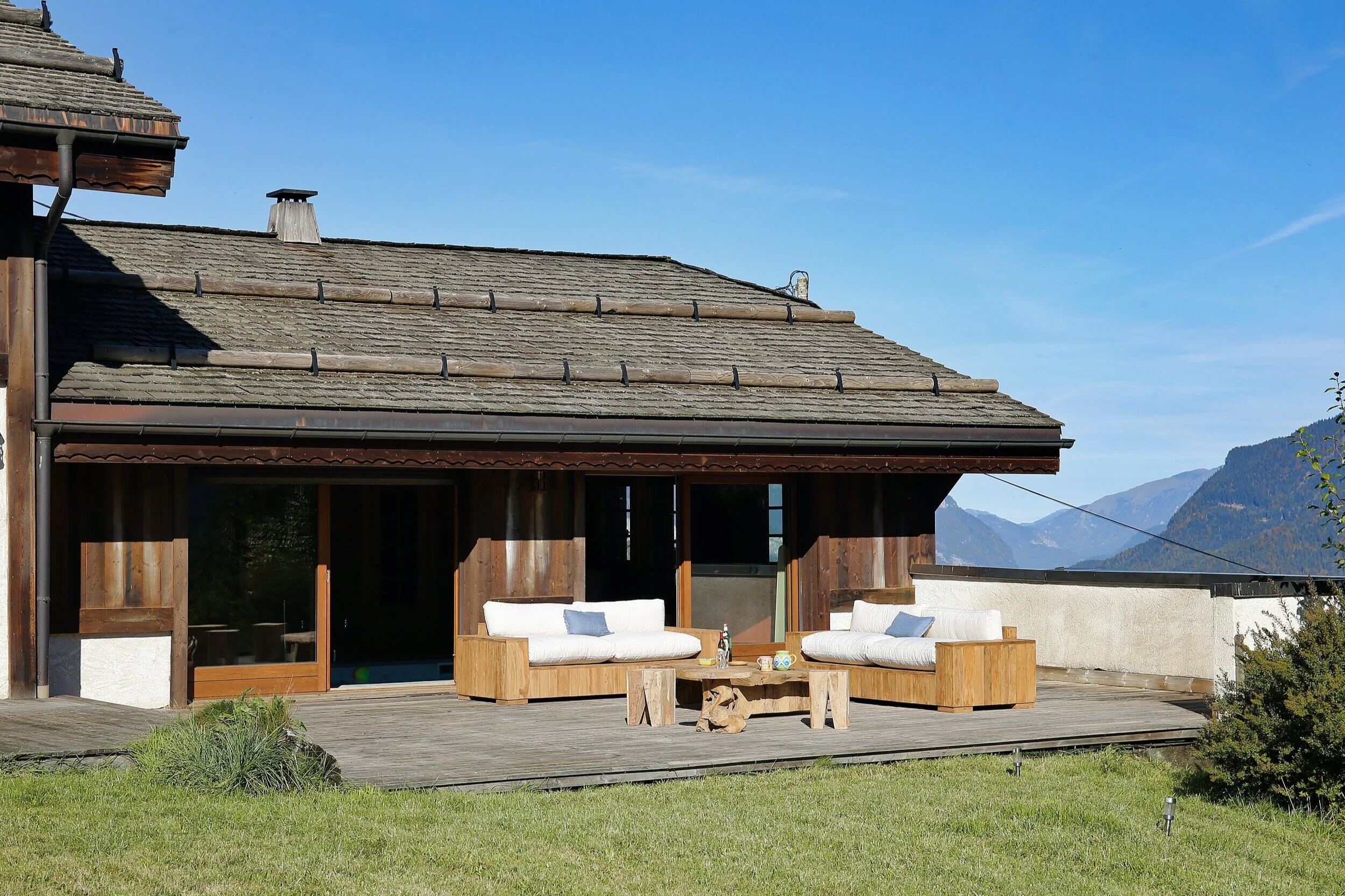 Sur la partie basse de la terrasse, en face de la piscine, ce salon d’été (ou d’hiver pour les courageux) offre une très belle vue de montagne et est le coin idéal pour un bain de soleil.