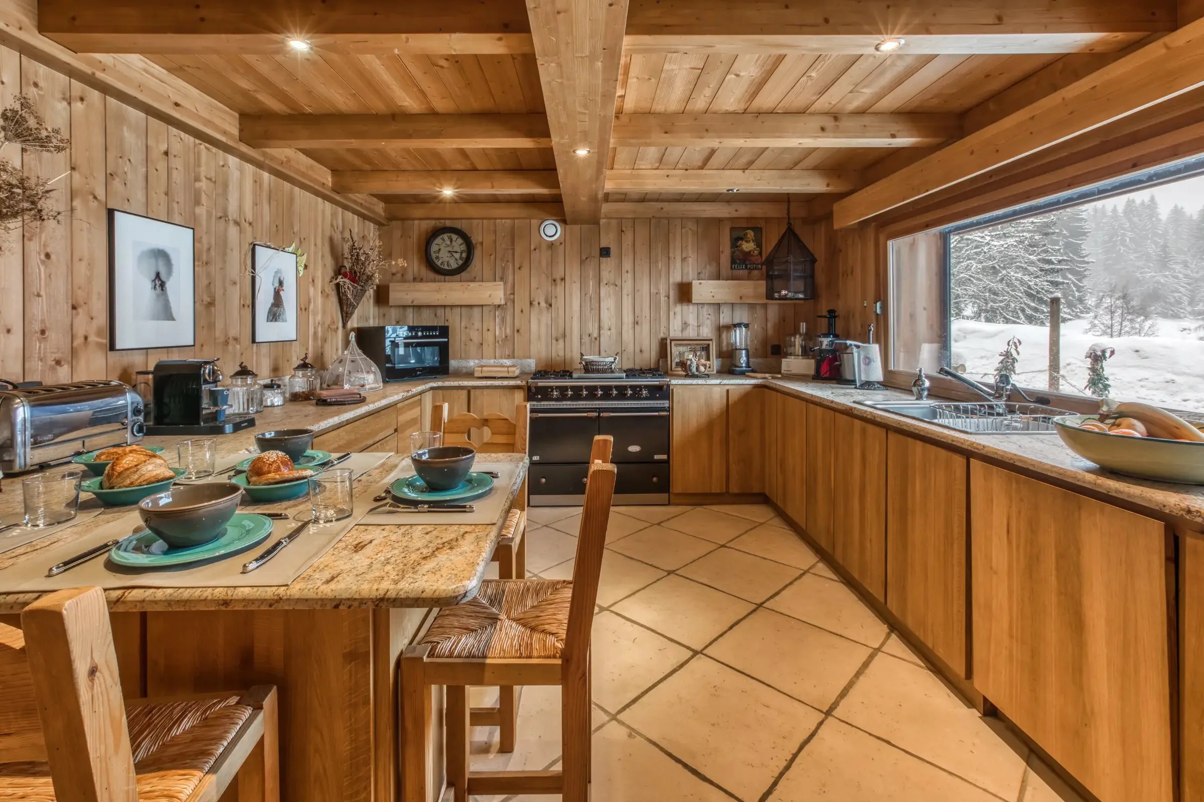 Située a l'entrée du chalet, la cuisine est un endroit agréable et lumineux pour prendre un petit déjeuner sur le bar avant de partir skier. Elle est équipée de tout le materiel nécessaire et plus encore.