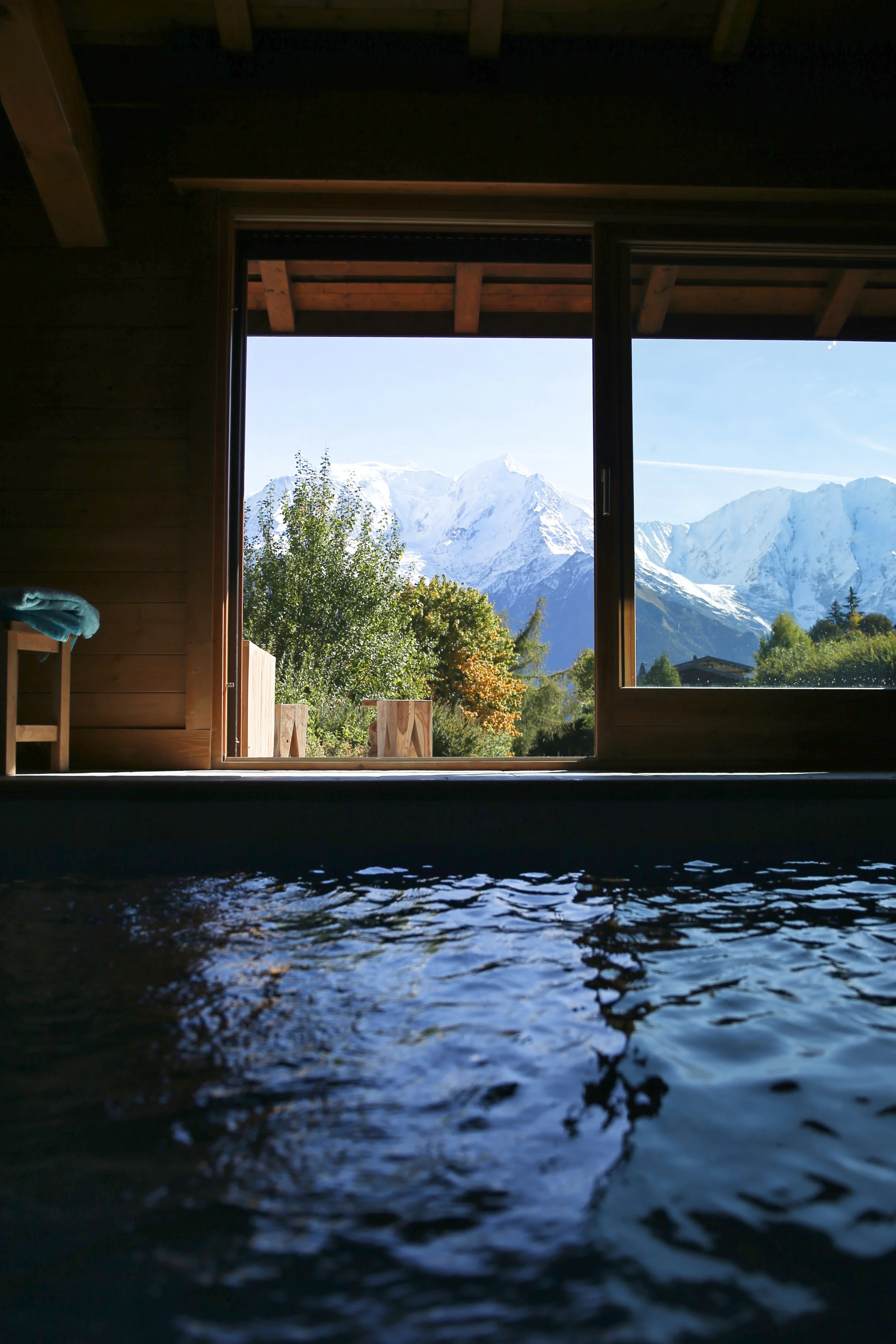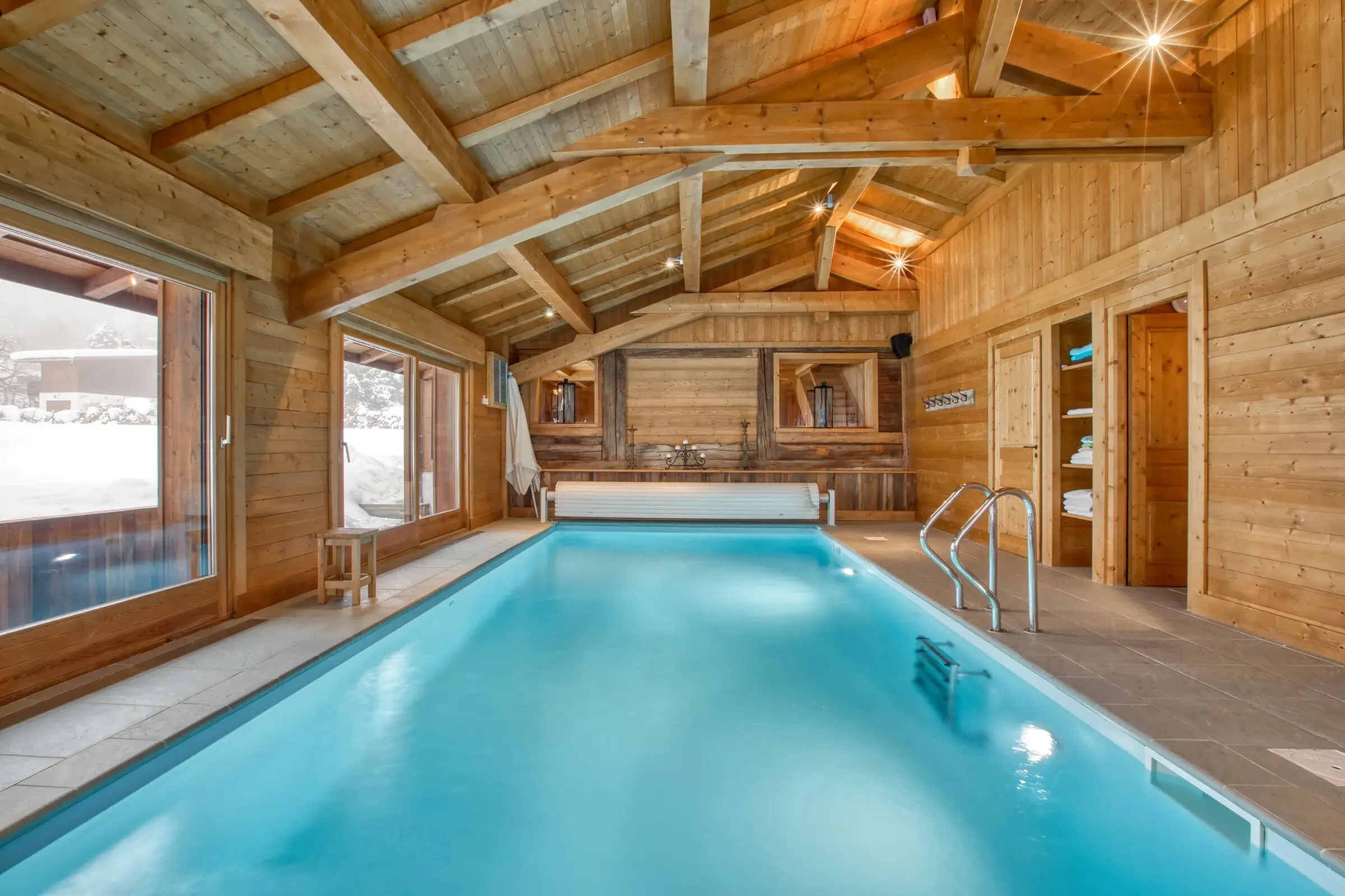 Couverte et chauffée, la piscine est équipée d’une salle de bain avec deux douches et WC et avec un accès direct à la terrasse avec vue sur le Mont-Blanc.